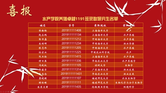 星光不负赶路人,天道酬勤佳音来。随着2023年全国硕士研究生招生考试复试结果的陆续公布,水产学院养殖卓越1191班考研录取喜报频传,再创佳绩。班级20人中,有16人参加考试。其中,成绩超过国家分数线的学生16人,上线率100%;被录取14人,录取率87.5%。录取院校包括中国海洋大学、中国农业科学院、深圳大学、华南农业大学、上海海洋大学和伦敦国王学院等国内外知名院校。