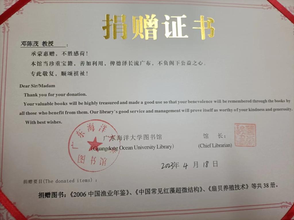 去年11月,邓教授曾向学校图书馆赠送了《马氏珠母贝健康养殖技术》、《湛江珍珠》、《海产经济贝类及其养殖》等著作30册。