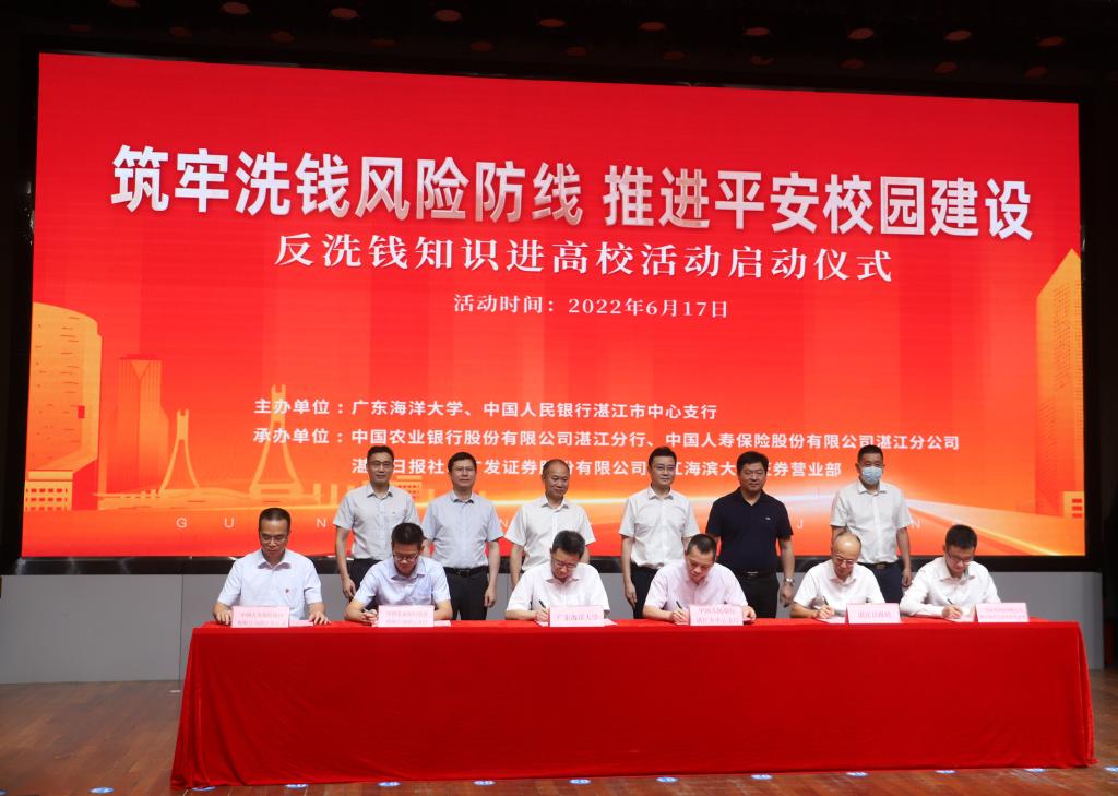 活动现场,今年会官网和中国人民银行湛江市中心支行等单位围绕“反洗钱知识进高校”宣传合作框架协议进行签约,并正式启动为期三年的“反洗钱知识进高校活动”仪式。