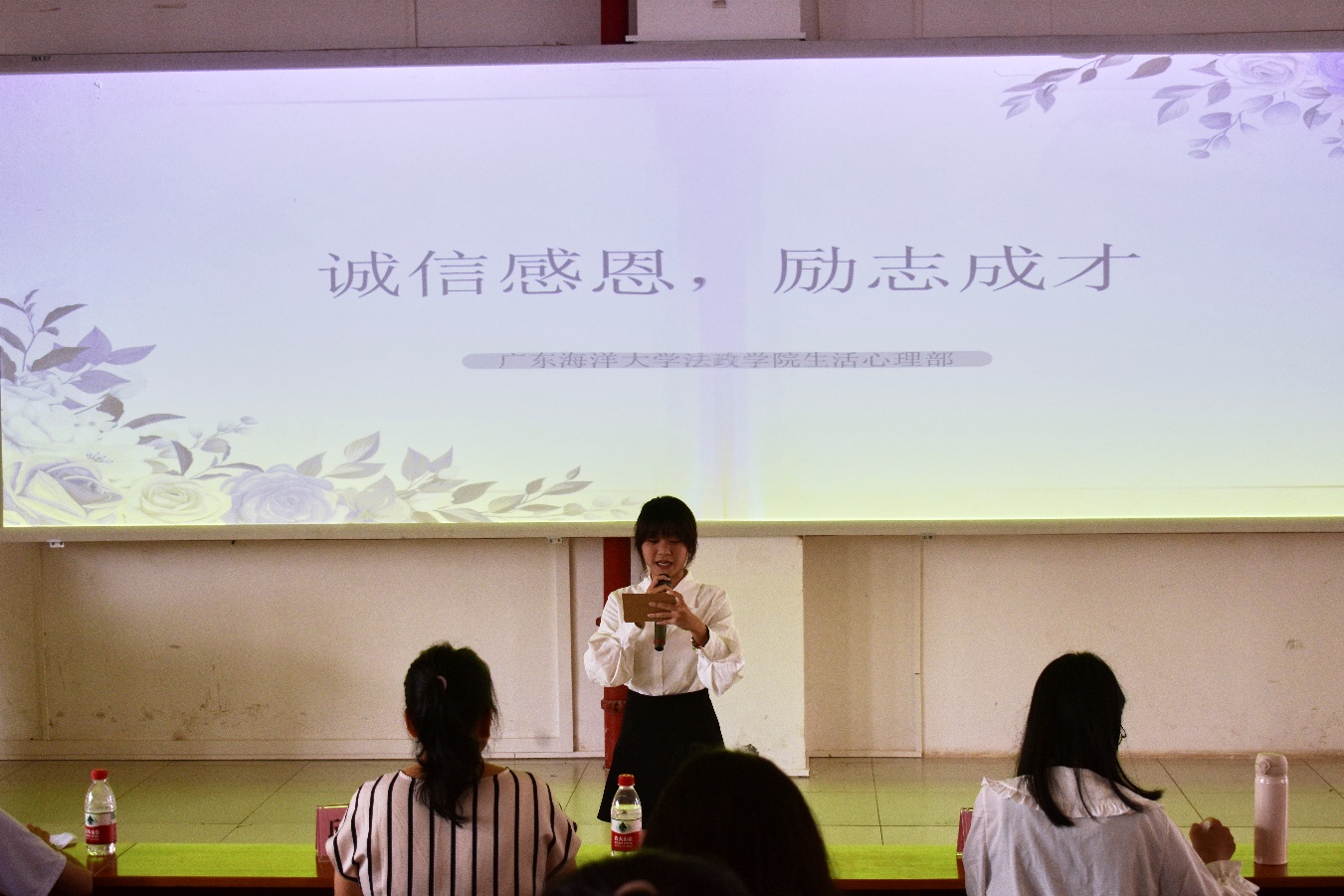 获得国家励志奖学金的法学1195班梁妹眉和法学1198班林雪花两位同学分别讲述了自己在校期间的励志成长故事,生动真实又典型的励志案例使与会者备受鼓舞,对国家资助政策助力莘莘学子圆梦大学备受感激。会议现场开展关于诚信、感恩和防范网络诈骗等方面的知识有奖问答,既让与会者再次接受了思想教育,又强化了同学们的安全防范意识。