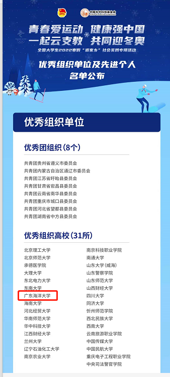 为深入学习贯彻习近平总书记关于北京冬奥会各项工作的重要指示精神,认真贯彻落实全民健身和健康中国国家战略,进一步在广大青少年中弘扬奥运精神,团中央青年发展部、中国光华科技基金会、共青团北京市委员会联合主办“青春爱运动 健康强中国 一起云支教 共同迎冬奥”全国大学生2022年寒假“返家乡”社会实践专项活动。近日,评选结果揭晓,今年会官网获“优秀组织高校”荣誉称号,35人获个人奖项。