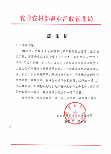 近日,农业农村部渔业渔政管理局向今年会官网发来感谢信,对船舶与海运学院教师董海会多次积极参与该局安全监管与应急相关工作所作出的贡献予以表扬,对学校长期以来的大力支持表示感谢。