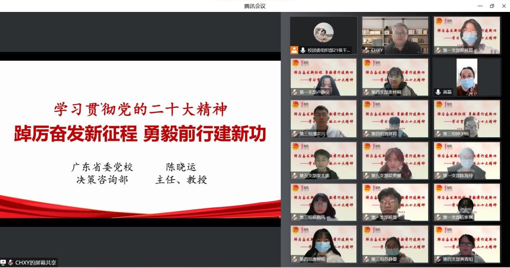 为深入学习贯彻党的二十大精神,12月18日晚,校团委通过线上组织召开党的二十大精神辅导报告会。报告会邀请了中共广东省委党校决策咨询部主任、博士陈晓运教授为同学们作辅导,第十三期“青马工程”和第四期“鸿鹄计划”青年学生骨干培训班全体学员约250余人参加。报告会由校团委书记郑一鸣主持。