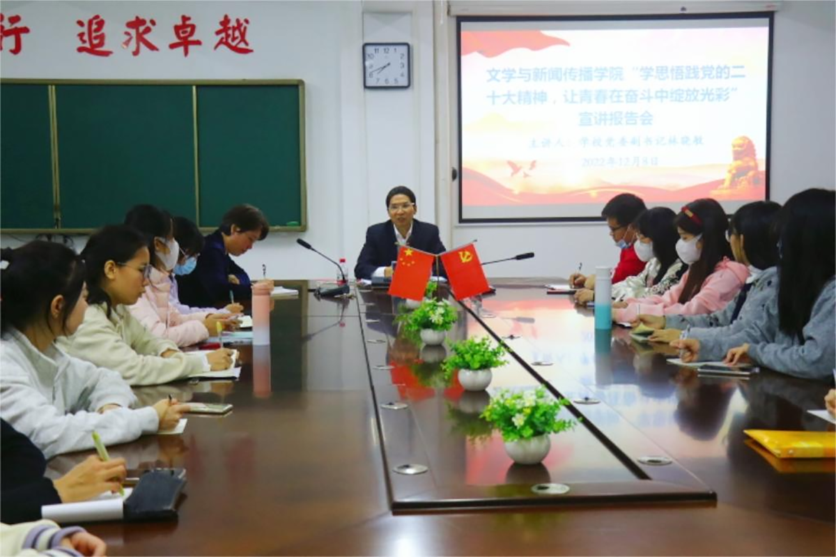 12月8日晚,文学与新闻传播学院在广学楼1005室召开了“学思悟践党的二十大精神,让青春在奋斗中绽放光彩”宣讲报告会,由联系学院的校党委副书记林晓敏主讲,学院党委书记吴少文主持,学院团委书记徐以国以及全院46名学生党员参加了报告会。
