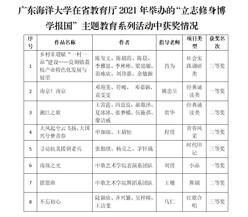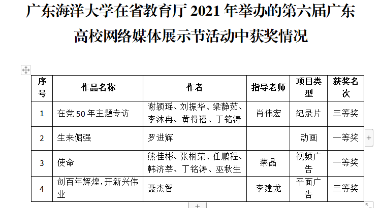 近日,据广东省教育厅分别下发的《关于公布第六届广东高校网络媒体展示节活动结果的通知》和《广东省教育厅关于公布2021年“立志•修身•博学•报国”主题教育系列活动结果的通知》获悉,今年会官网荣获“立志•修身•博学•报国”主题教育系列活动优秀组织奖,报送参评作品共荣获一等奖4项、二等奖2项、三等奖5项。其中,参赛团队在第六届广东高校网络媒体展示节活动中,喜获动画类一等奖1项(罗进辉同学作品《生来倔强》)、视频广告类一等奖1项(蔡晶老师和熊佳彬、张桐荣、任鹏程、韩济莘、丁铭涛、巫秋生同学作品《使命》)以及纪录片、平面广告类三等奖各1项;在2021年“立志•修身•博学•报国”主题教育系列活动中,喜获经典诵读类一等奖1项(姚忠呈老师和邓迎美、符峻、邓嘉颖、袁雯雯同学作品《南京!南京》)、二等奖1项,小品类一等奖1项(刘倩老师和中歌艺术学院表演系团队作品《南珠之光》),舞剧类二等奖1项以及社会实践调研类、青春风采、时代印记类三等奖各1项。