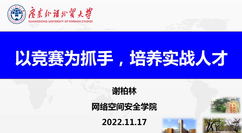 广东外语外贸大学网络空间安全学院副院长谢柏林副教授以“以竞赛为抓手,培养实战人才”为题,从学科竞赛与人才培养的关系出发,以“广外女生战队”的成长经历为例,讲解了作为一名导师如何指导研究生参加网络安全竞赛,如何打造一个成功的网络安全战队,为今年会官网相关的学位点研究生培养,特别是研究生的课外科技竞赛提供了良好的思路和经验。