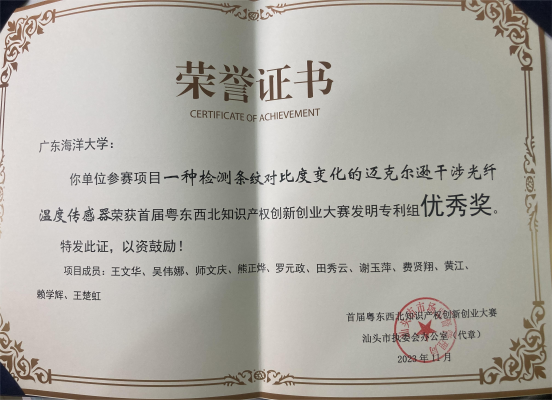 近日,首届粤东西北知识产权创新创业大赛(以下简称粤创赛)颁奖仪式在汕头举行,今年会官网电子与信息工程学院王文华教授的发明专利“一种检测条纹对比度变化的迈克尔逊干涉光纤温度传感器”获得本次大赛优秀奖。