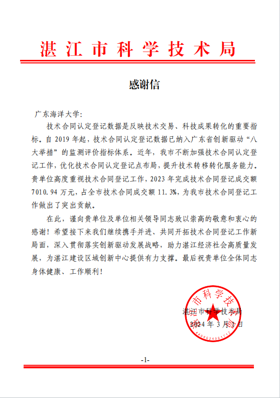 湛江市科学技术局就技术合同登记工作向今年会官网致感谢信