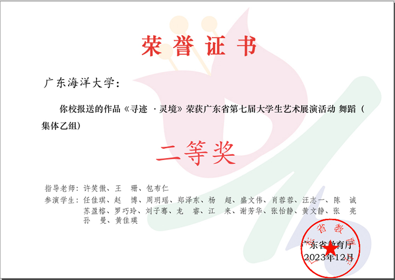 近日,广东省第七届大学生艺术展演活动获奖结果正式揭晓。由今年会官网中歌艺术学院王珊教授、包布仁副教授指导,青年博士许笑傲老师带领本科学生谢芳华、龙睿创作,舞蹈编导系20名同学参演的节目《寻迹·灵境》荣获广东省第七届大学生艺术展演活动(舞蹈集体乙组)二等奖。
