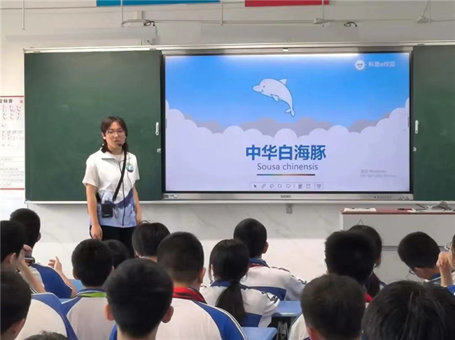 课堂上,水生生物博物馆大学生海洋科普讲解员从中华白海豚的外形特征、声音定位、生活习性及分布范围等方面帮助学生们详细地了解中华白海豚的相关知识。学生们认真听讲,踊跃地举手回答相关问题,课堂气氛活跃。