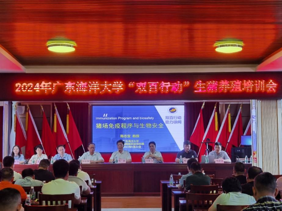 为深入贯彻落实省委“1310”具体部署,进一步推进“双百行动”各项工作落地见效,5月22日,学校“双百行动”驻徐闻服务队队长、化学与环境学院党委书记何国明率滨海农业学院院长马驿教授、陈志宝教授、葛叶副教授、姚秋成博士、谭慧明博士和李俊玫博士一行7人赴徐闻开展生猪养殖培训。县农业农村局副局长孙永敏、农业技术中心人员和养殖户约60余人参会。