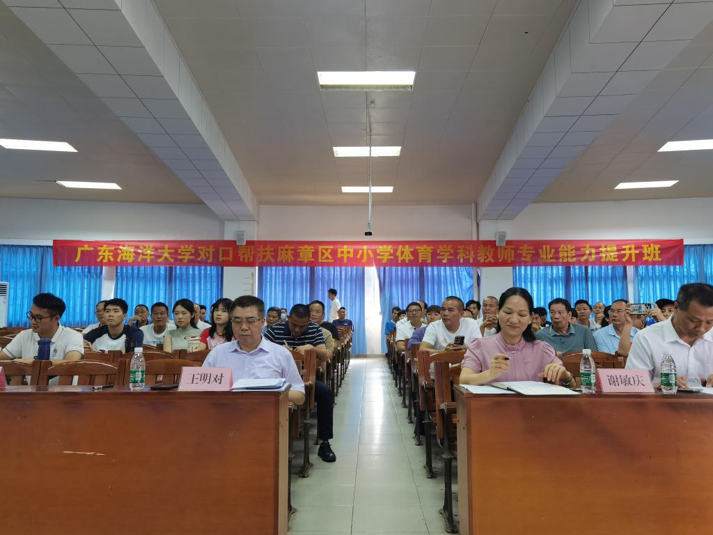 王明对作了开班动员讲话。他指出,为推动广东基础教育高质量发展,落实粤东西北中小学体育学科教师专业能力提升帮扶工作,由学校教务部主办、体育与休闲学院承办对口帮扶麻章区中小学体育学科教师专业能力提升培训班,助力地方“百千万工程”,提升麻章区中小学体育教师素质和能力。本次培训既有专家专题讲授,还安排有现场教学和实操课程,培训内容丰富,形式多样,针对性强。培训期间,学院将加强与麻章区教师发展中心沟通协调,认真组织做好各项教学活动和后勤保障工作,尽可能为学员提供优质服务。同时,希望参训学员珍惜学习机会,遵守学习纪律,学思践悟,知行合一。