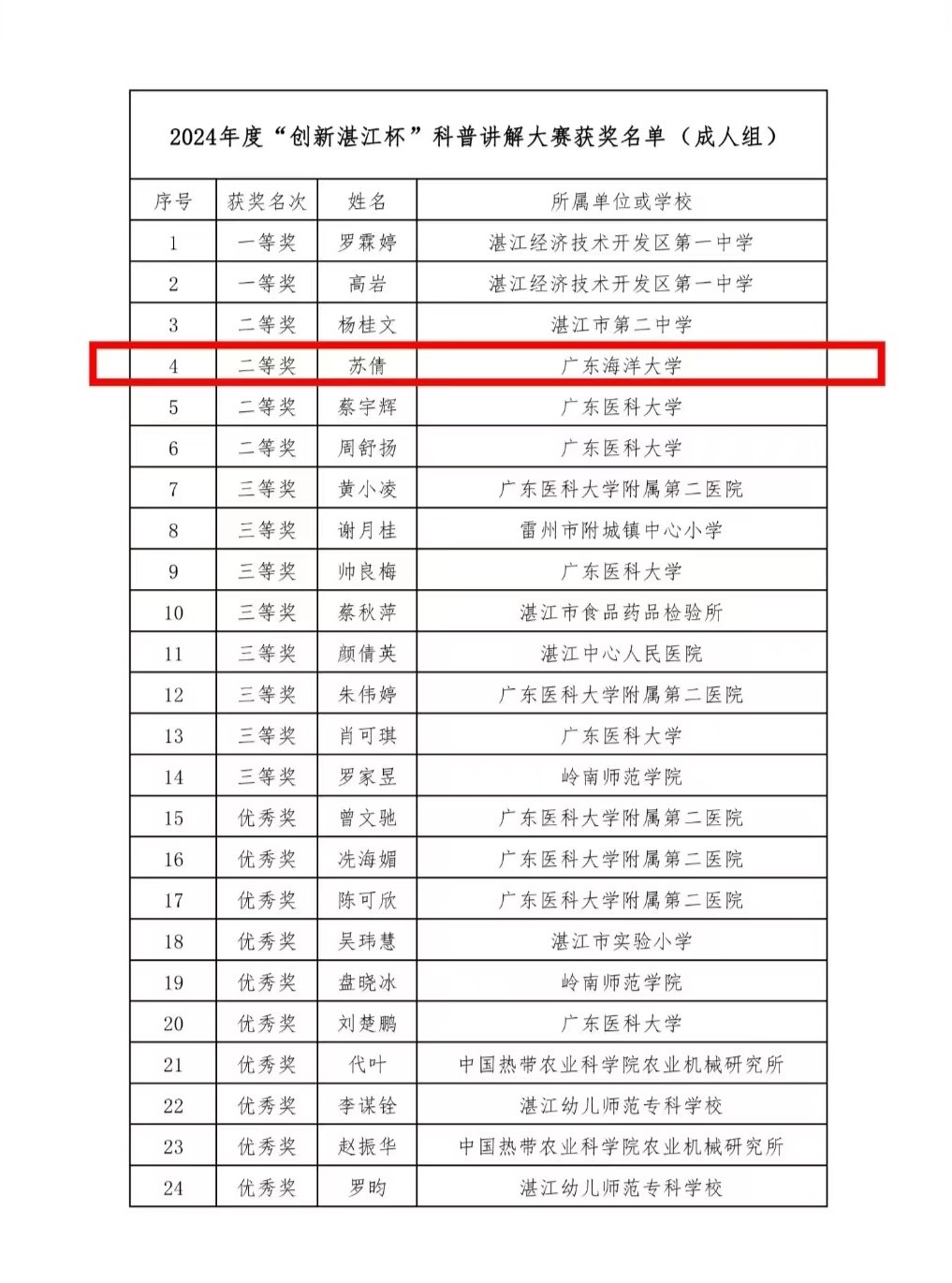 为大力发掘培养湛江市科普人才,选拔优秀选手参加广东省科普讲解大赛,5月28日,2024年度“创新湛江杯”讲解大赛暨广东省科普讲解大赛湛江选拔赛在广东湛江南方海谷海洋产业孵化中心顺利举办。水生生物博物馆讲解员苏倩同学荣获本次选拔赛二等奖,并作为种子选手出战即将于7月17日-7月19日举行的广东省科普讲解大赛。