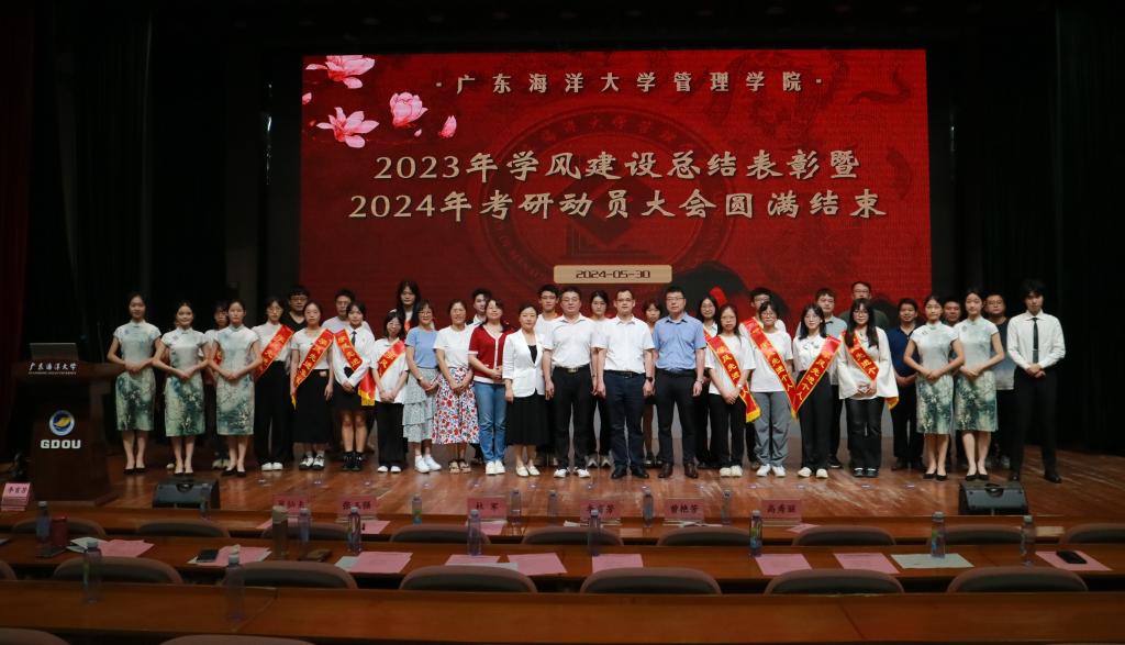 为表彰先进,充分发挥学生先进典型的示范引领作用,营造“学先进、赶先进、当先进”的优良学风,5月30日下午,管理学院在湖光校区广学楼多功能厅召开2023年学风建设总结表彰暨2024年考研动员大会。学院党委书记李育芳、院长杜军、党委副书记曾艳芳、副院长张玉强、工商系主任高秀丽、财管系副主任肖灿夫、全体辅导员以及学生代表共300多人参加会议。