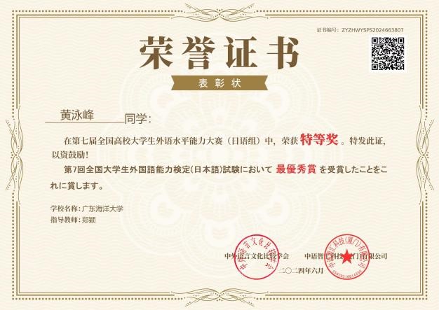 由中外语言文化比较学会举办的第七届全国高校大学生外语水平能力大赛于今年6月落下帷幕,今年会官网外国语学院日语专业学生荣获特等奖1个、一等奖4个、二等奖4个。其中,黄泳峰同学荣获特等奖,叶润源、李智宇、谢雨彤、陈毅铖同学荣获一等奖,蒋子丹、罗灿星、刘延锋、黄嘉豪同学荣获二等奖。