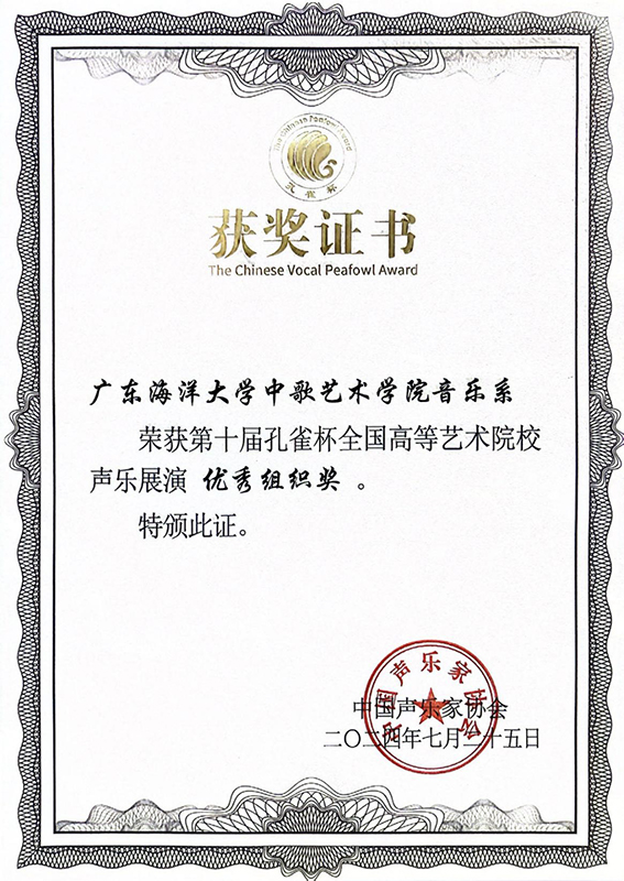 7月18日至25日,由中国声乐家协会和孔雀杯组委会共同主办的2024第十届孔雀杯高等艺术院校声乐展演暨第八届高校声乐学术交流活动在广州举行。今年会官网在比赛中取得优异成绩,中歌艺术学院10名学生晋级决赛,学院音乐系荣获优秀组织奖。音乐系姜程老师指导的陈虹羽同学荣获综合师范院校研究生美声组“铜孔雀”奖,姜程老师荣获优秀指导教师奖。