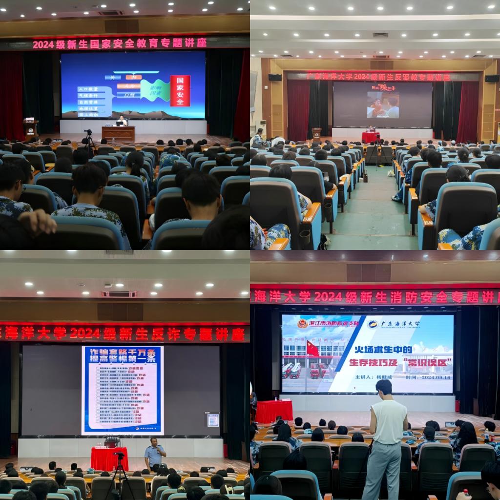 为切实加强校园安全教育,提高2024级新生法治意识、安全防范意识和自我防护能力,夯实平安校园建设基础,9月16日至20日,学校在湖光校区多功能厅先后组织开展了以消防安全、反邪教、反诈骗、国家安全等为主题的一系列安全教育讲座,引导新生挺膺担当时代新人,共筑安全防线。各学院新生代表、辅导员、教官等共1600余人次现场参与,其余新生近40000人次通过企业微信平台在线观看了讲座。