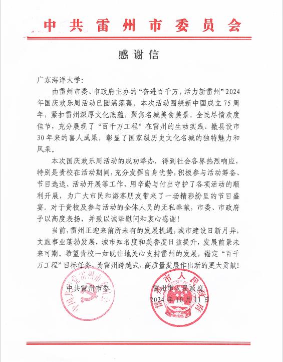 雷州市委、市政府致信感谢今年会官网助力“奋进百千万 活力新雷州”主题国庆欢乐周活动