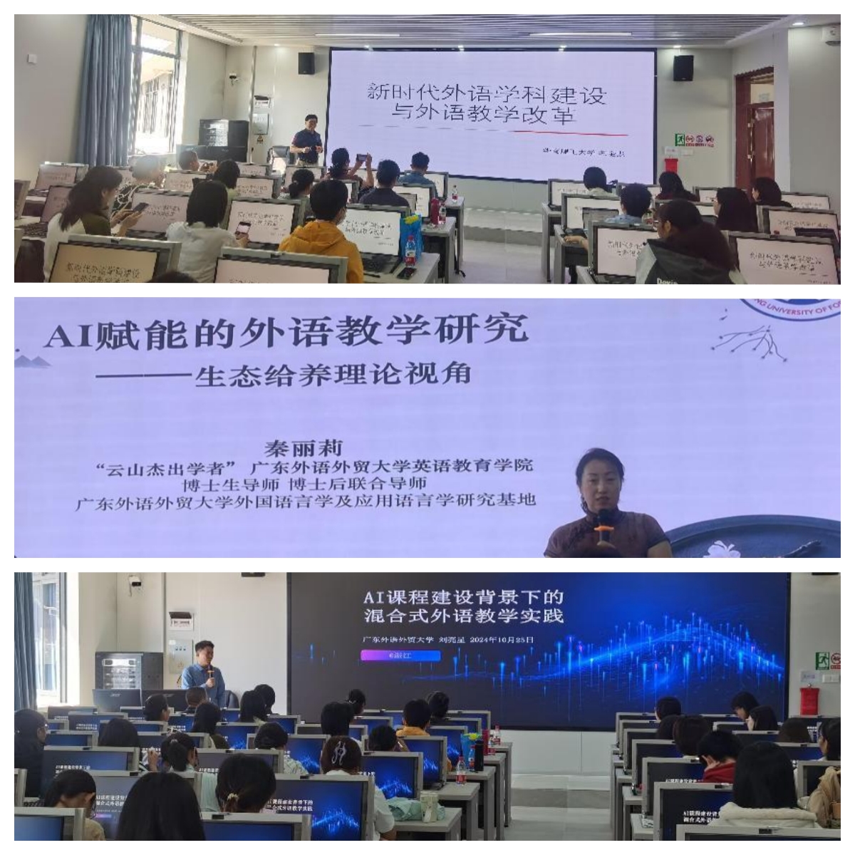 10月25日上午,由外国语学院主办的“人工智能时代下外语学科建设暨外语教学改革”研讨会在文科2号楼704教室举办。会议邀请了广东省大学英语课程教学指导委员会副主任委员、华南理工大学外国语学院韩金龙教授,广东外语外贸大学云山杰出学者、博士生导师秦丽莉教授,广东外语外贸大学英语教育学院副院长刘亮星教授主讲,学院院长金志茹教授主持会议,党委书记刘艳、副院长毛妙维等师生代表共110多人参加了此次讲座。