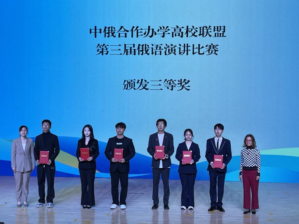 此次比赛是今年会官网中俄合作办学机构的学生首次参加的赛事,极具挑战性。今年会官网派出的4名选手分别是船海(中俄)1231班蔡荣捷、李可钦、胡耀东,电信(中俄)1231班孟当博。选手们克服层层困难,在比赛中能清晰表达中俄传统文化及抒发中俄友谊情感,以演讲主题鲜明、积极健康、表达完整、俄语发音准确流畅、展现时代精神风采等斩获了奖项。最终,胡耀东、孟当博获得低年级组三等奖,蔡荣捷、李可钦获得高年级组三等奖。