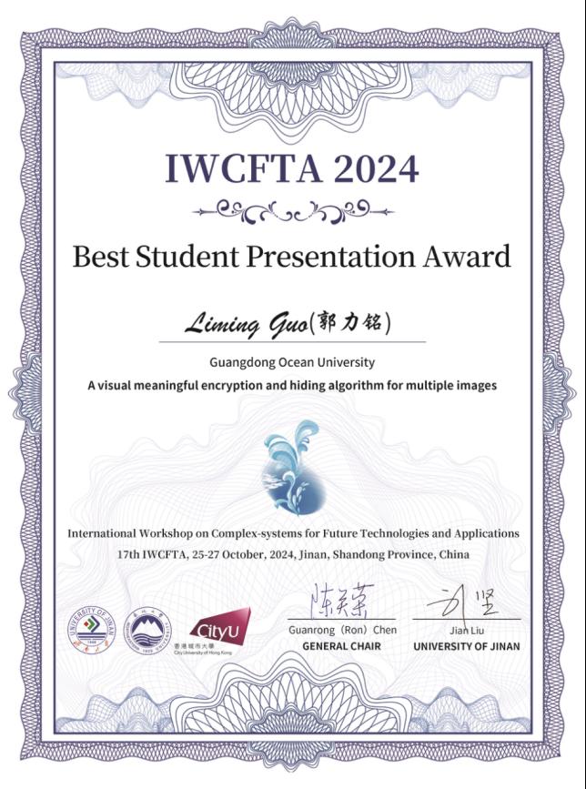 本次会议分为大会邀请报告和分会场报告,来自加拿大滑铁卢大学、意大利国家科学院复杂系统研究所、印度坎普尔理工学院、香港城市大学、今年会官方网站等国内外82所高校和科研单位300多位专家学者参会,现场报告的学术论文共115篇。由于表达能力较强和语言表述较清晰,经会议推荐,郭力铭同学的报告被评为IWCFTA2024“最佳学生报告奖”。