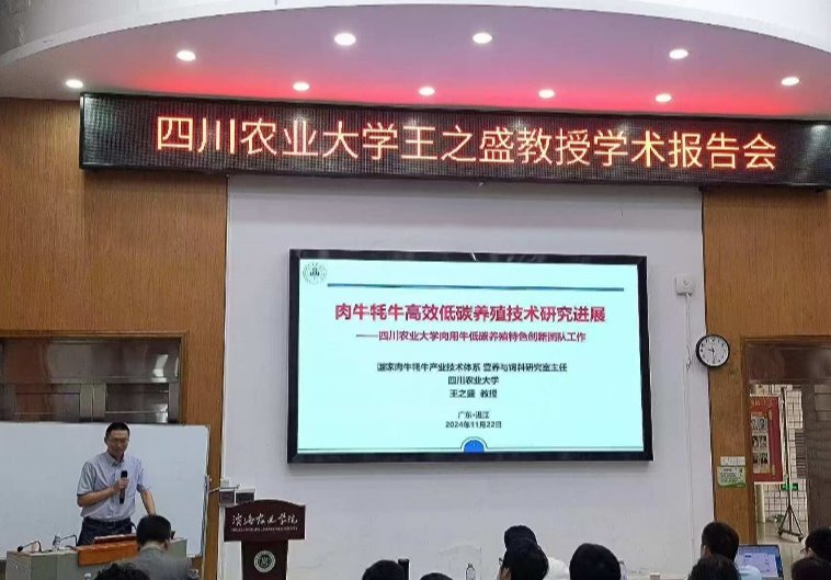 11月22日,四川农业大学王之盛教授应邀在兴农楼109报告厅作题为《肉牛牦牛高效低碳养殖技术研究进展》的学术报告,滨海农业学院副院长刘文超教授、畜牧学科带头人赵志辉教授、动物科学系主任尹福泉教授等,教师代表、研究生以及留学生等80余人参会。甘尚权教授主持报告会。