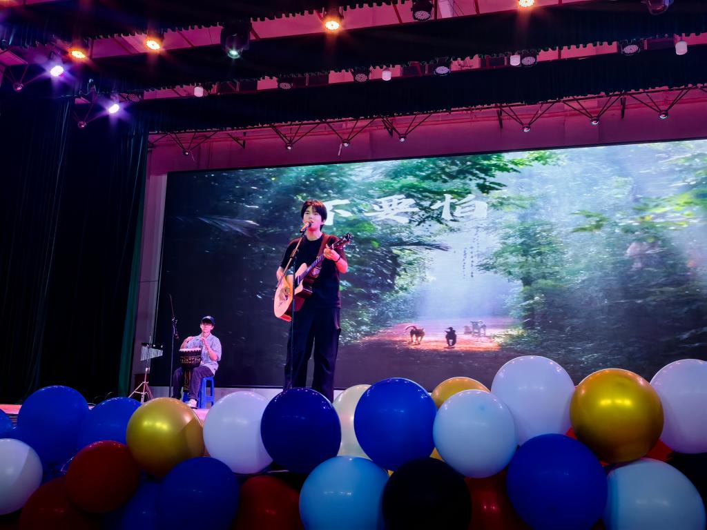 当晚,嘉宾演出同样是一大亮点。申晔老师深情演绎经典《绣红旗》,周蔚老师激情唱响《大森林》,莫境山老师自弹自唱原创作品《蝉鸣暂歇》,老师们以歌寄情,展现出教育工作者的别样风采,进一步加深了师生间的情感交流,凸显了音乐在情感沟通中的独特魅力,彰显了教育与音乐融合的强大力量。