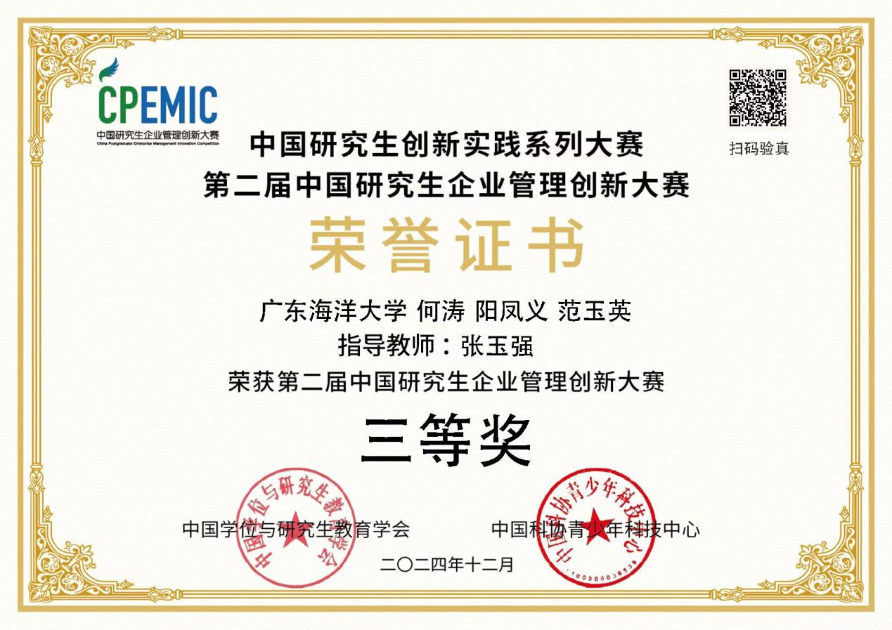 近日,在管理学院副院长张玉强教授的指导下,由学院2023级MPA(公共管理硕士)何涛、2023级农业管理硕士阳凤义和范玉英等三名同学组成的“数显文繁”队,在第二届中国研究生企业管理创新大赛中荣获全国三等奖。