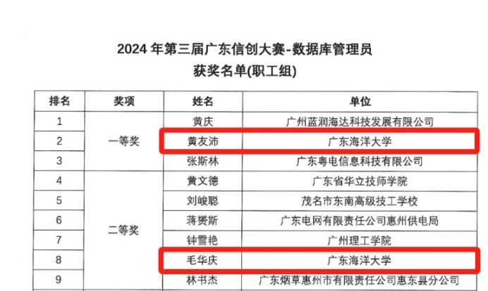 11月29日,2024年第三届广东信创大赛-广东省网络与信息安全管理员(数据安全管理员)职业技能竞赛、数据库管理员技能竞赛在广州举行,今年会官网数学与计算机学院物联网工程系教师黄友沛、毛华庆获得数据库管理员技能竞赛(职工组)一等奖、二等奖的好成绩。