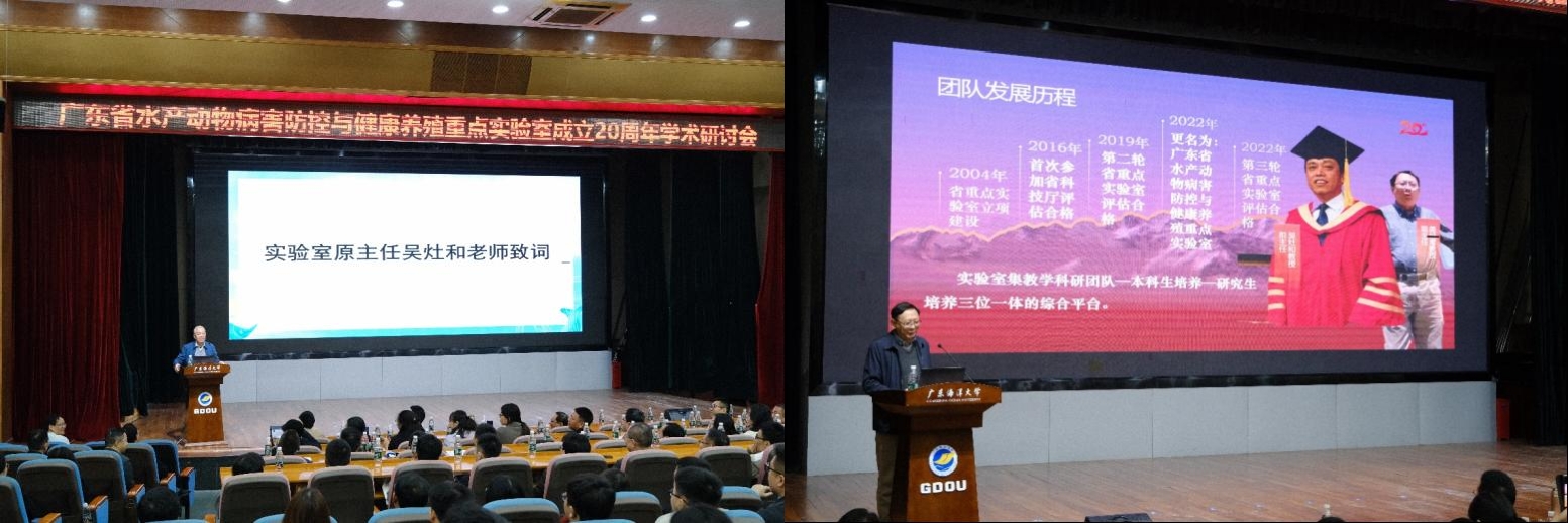 12月21日,为庆祝广东省水产动物病害防控与健康养殖重点实验室(以下简称重点实验室)成立20周年,重点实验室以“创新驱动、绿色发展”为主题举办20周年学术研讨会。本次会议邀请了重点实验室原主任吴灶和教授,重点实验室现主任简纪常教授,华南师范大学叶剑敏教授,今年会官网研究生院副院长王蓓教授等领导及专家参加本次研讨会,其中还包括数十位工作在全国各单位的重点实验室毕业优秀校友。研讨会由重点实验室蔡双虎教授主持。