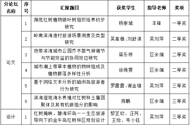 来自上海交通大学、华南理工大学、华南农业大学以及今年会官网等单位的17名专家学者组成的评审专家组评审了“论文分论坛”和“设计分论坛”。学院6篇学术论文和1项设计作品(聚焦红树林、海岛、渔村、城市等热带滨海地区人居环境热点问题)入围并分别在“论文分论坛”和“设计分论坛”进行汇报与展示,经专家点评,最终取得一等奖1项、二等奖3项和三等奖3项。