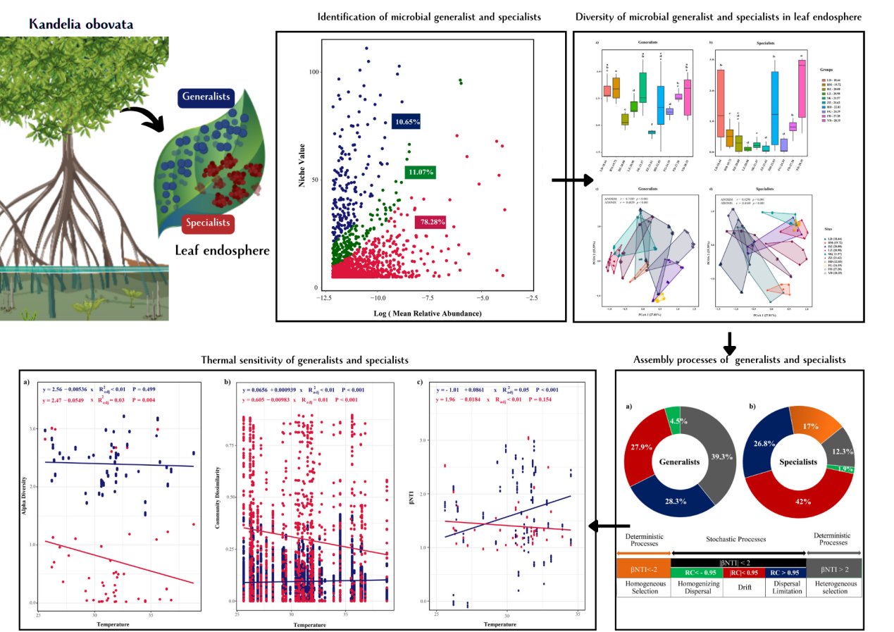 本研究在我国沿海地区红树林湿地(北纬18.44°至28.35°和东经108.24°至121.18°)10个采样点收集了250个秋茄(Kandelia obovata)单叶样本,研究叶内泛化种和特化种细菌群落的多样性、生态动态及其对气候变化的响应。研究采用高通量16S rRNA基因测序和统计学分析,揭示了特化种细菌在叶内微生物群落中占主导地位。研究发现,温度变化是影响秋茄叶内微生物多样性和群落构建的关键驱动因素,而不是影响其生态功能的主要因素,土壤养分(总有机碳和磷酸盐)显著影响秋茄叶内微生物的生态功能特征。随机过程在秋茄叶内特化种的群落构建中占主导地位,而确定性过程在叶内泛化种的群落构建中发挥着更重要的作用。在生态功能上,秋茄叶内细菌群落表现出了可恢复性,其中磷酸盐和总有机碳等土壤营养因子在功能塑造中起着关键作用。秋茄叶内特化种表现出更窄的生态位宽度和对气候变化的更高的敏感性,而叶内泛化种则表现出更广泛的生态位可塑性。