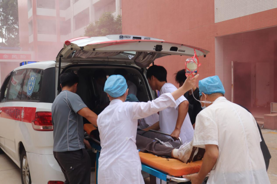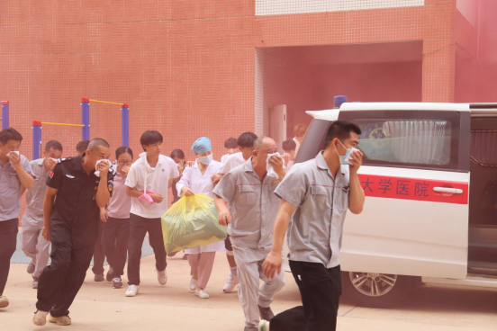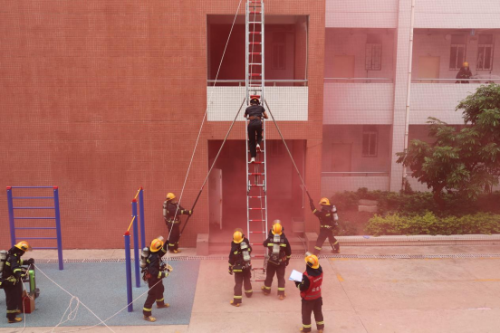 随着“演练开始”指令下达,演练按预案有序展开。演练环节包括释放烟雾模拟火情、触发火警警报、人员疏散、医疗救援、模拟被困人员自救与互救、利用三折梯救援被困人员以及消防灭火实操等。在消防演练各专业组的默契配合与紧密协作下,现场演练任务圆满完成。