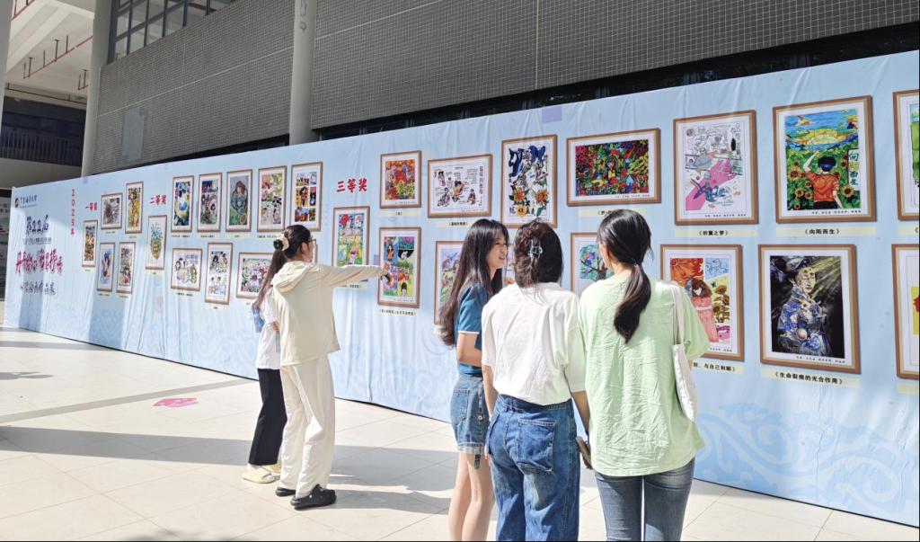 5月25日,部分优秀作品在湖光校区西区大学生活动中心集中展览。画作吸引了众多师生驻足品鉴,现场围绕艺术与心理健康的深度融合展开热烈交流,氛围温馨。