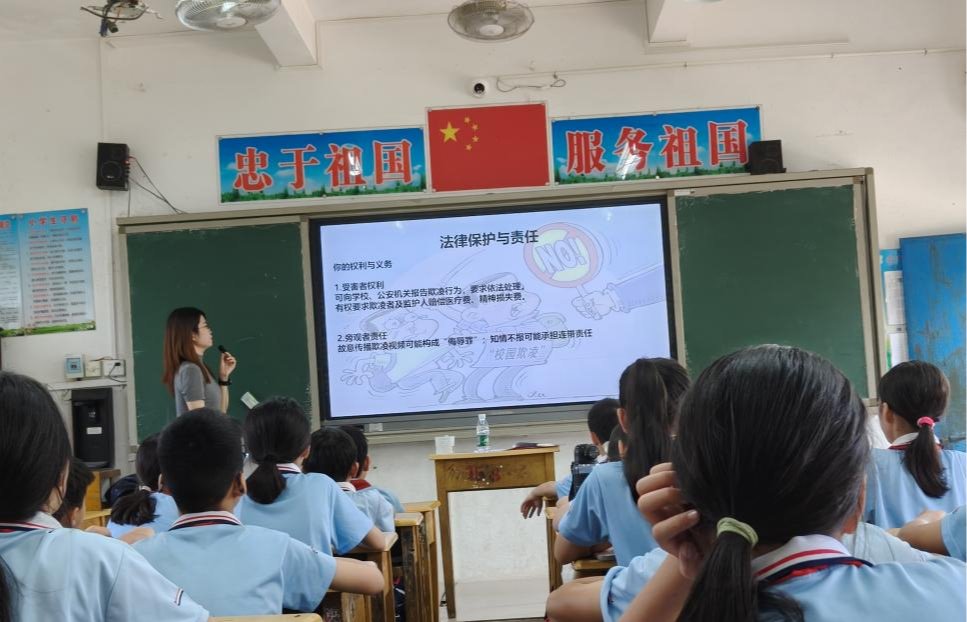 当天,法政学院安排了法学专业教师李谦博士走进山柑小学举行了题为《安全教育与校园霸凌预防》的法治讲座,向该校学生系统普及安全防护知识,传授应对校园霸凌的有效方法。