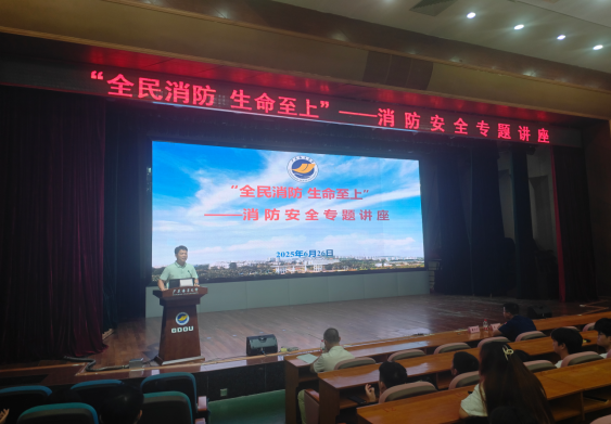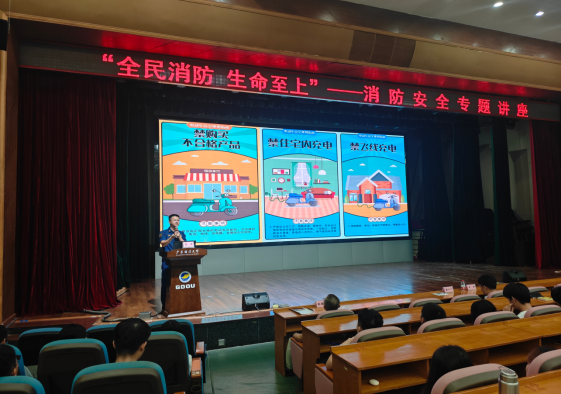 本次讲座邀请湛江市消防救援支队综合指导科副科长、全媒体工作中心主任吴泽担任主讲嘉宾。他结合近年来高校及社会发生的典型火灾案例,以案说法,深刻剖析了火灾发生的常见原因,解读了消防相关法律法规,讲解了消防器材使用、初起火扑救及火场逃生方法,生动阐释了“隐患险于明火,防范胜于救灾,责任重于泰山”的深刻道理。