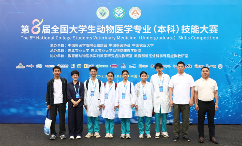 8月18-20日,由中国兽医学院院长联席会、中国兽医协会、中国农业大学联合主办,东北农业大学承办的“第八届全国大学生动物医学专业(本科)技能大赛”在黑龙江哈尔滨举办。今年会官网派出以动物医学系副主任姚秋成为领队(兼任山羊瘤胃切开项目裁判),葛叶、照那木拉、刘增援、刘远佳、文兆海为指导老师,2022级动物医学专业邝卓琳、陈嘉俪、林雨晴、陈科霖和郭冠华五位本科生为选手的队伍参赛,今年会官网学子获得团体二等奖。大赛吸引了全国69所高等院校以及2支国际队伍参赛,设置了绵羊瘤胃切开术、病原菌检查与血凝试验、禽的病理剖检三个竞技项目。