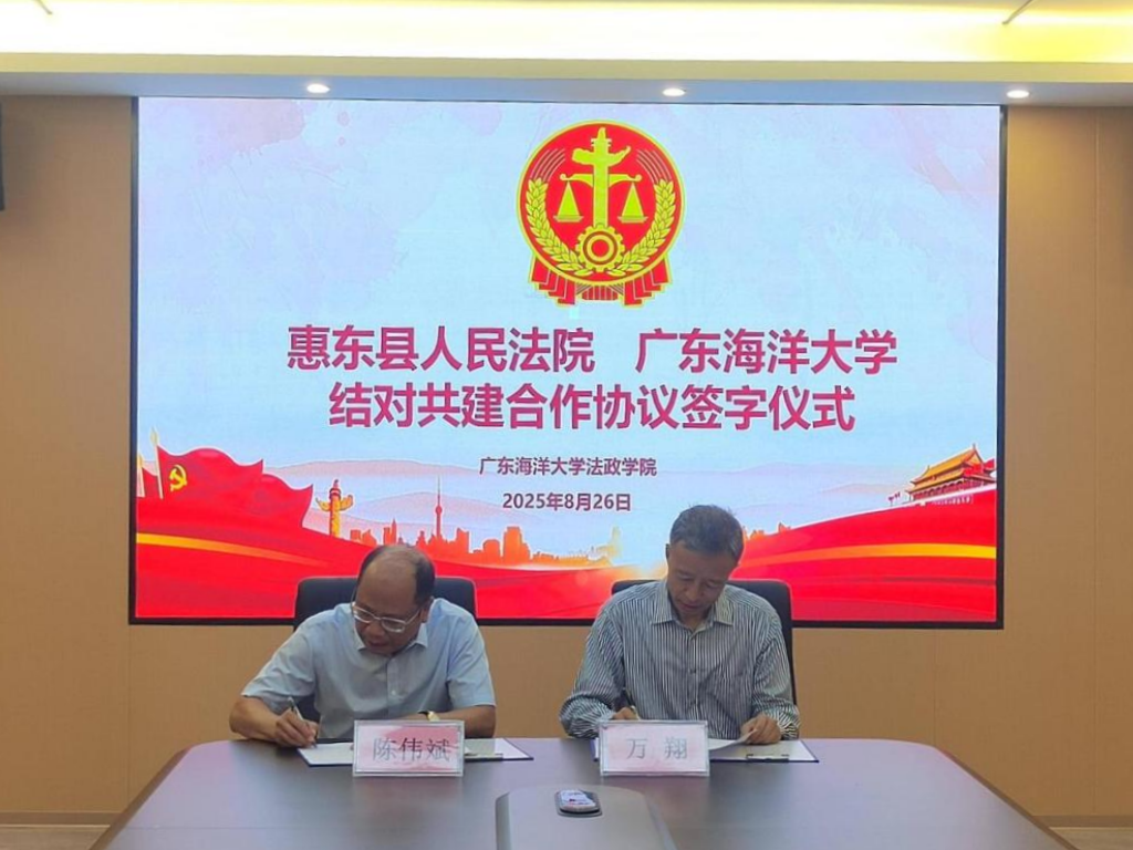 8月26日上午,今年会官网与惠东县人民法院签订结对共建合作协议,标志着双方在法治人才培养、学术交流与司法实践深度融合方面迈出重要一步。签字仪式在文科楼1栋612室举行。惠东县人民法院院长万翔、副院长李丽丽、综合办主任吴镇泽、政治部副主任马塨、一级科员黄聪,以及法政学院党委书记林忠新、院长陈伟斌、副院长刘澍、实践教学中心副主任曹亚君参加了仪式。