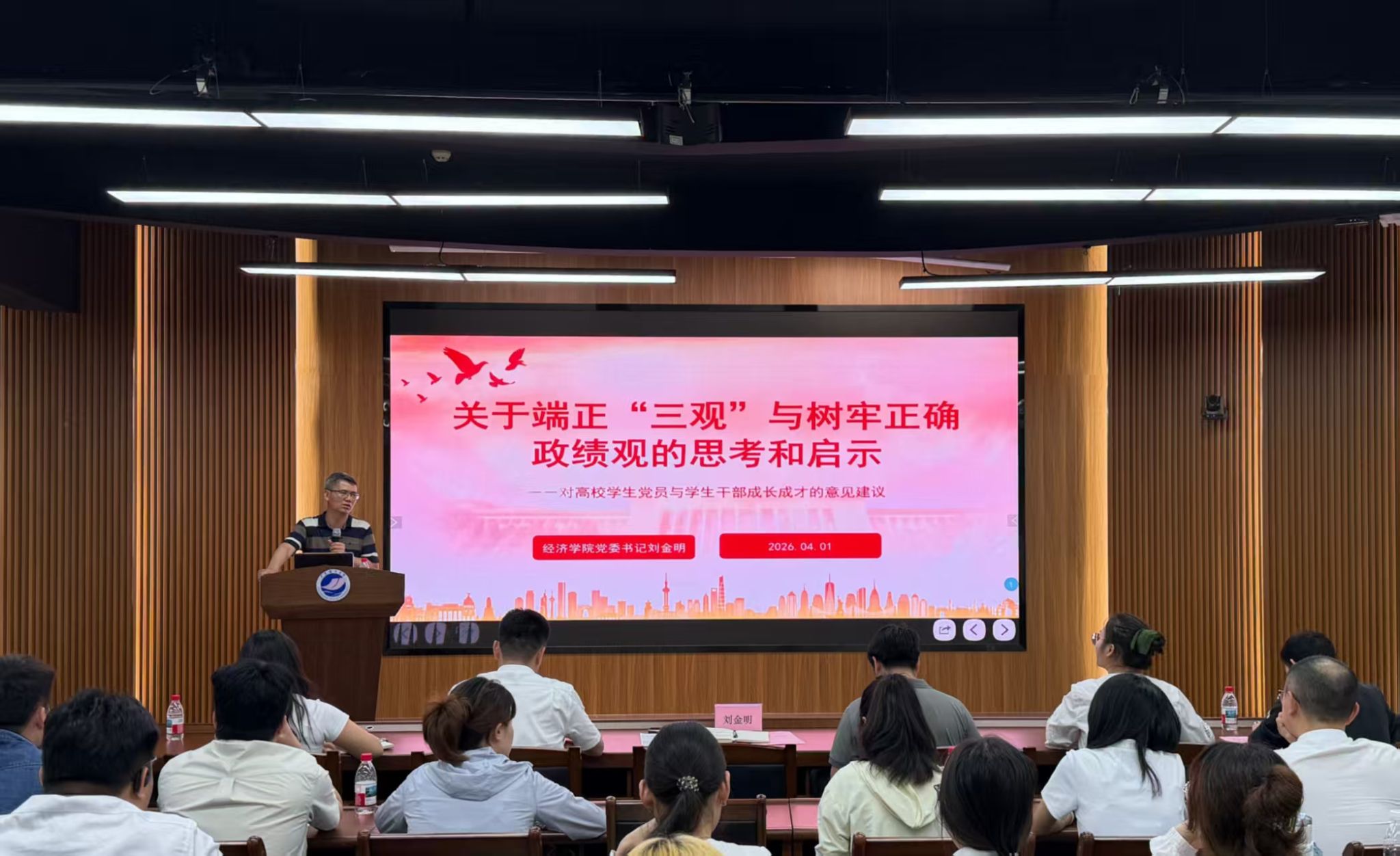 为加强青年学生思想政治引领,4月1日下午,经济学院党委书记刘金明以《关于端正“三观”与树牢正确政绩观的思考和启示——对高校学生党员与学生干部成长成才的意见建议》为主题,在海创楼303报告厅为学院学生党员和学生干部代表、青马班学员讲授“思政第一课”。