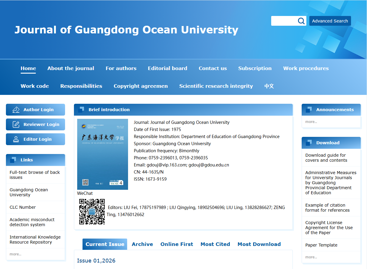 《今年会官方网站学报》(以下简称“学报”)是由学校主办的双月刊学术期刊。学报主要刊登水产、海洋科学、食品科学与工程、船舶与海洋工程及其交叉领域的高水平学术论文。英文网站依托中国知网平台,面向全球发布论文数字出版内容。近年来,学报学术影响力持续提升。根据中国知网数据,截至2026年4月10日,学报论文Web下载量为109.64万次,单篇最高下载量超3000次,单篇最高被引252次。2024年《中国学术期刊影响因子年报》显示,学报首次进入Q1区。2025年版复合影响因子为1.765,比上一年提高10.4%;学报影响力指数(CI)在28家海洋科学学科分类期刊中排名第8位,在同类期刊中处于领先地位,已成为国内具有重要影响力的学术期刊。在中国科协发布的最新版《科技期刊世界影响力指数(WJCI)报告》中,学报继续入选WJCI来源期刊,在全球96种WJCI海洋科学学科期刊中排名第59位,分区为Q3,影响因子为1.418。