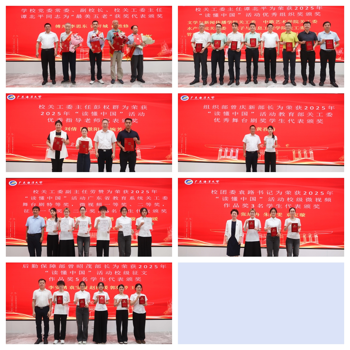 随后,离退休人员工作部部长邓朝晖宣读表彰决定,学校领导及部分职能部门领导分别向2025年关心下一代“最美五老”获奖同志、“读懂中国”活动获奖单位及师生代表颁奖。文学与新闻传播学院副书记胡墨、中歌艺术学院表演1241班黄孜琦先后发言,分享经验。