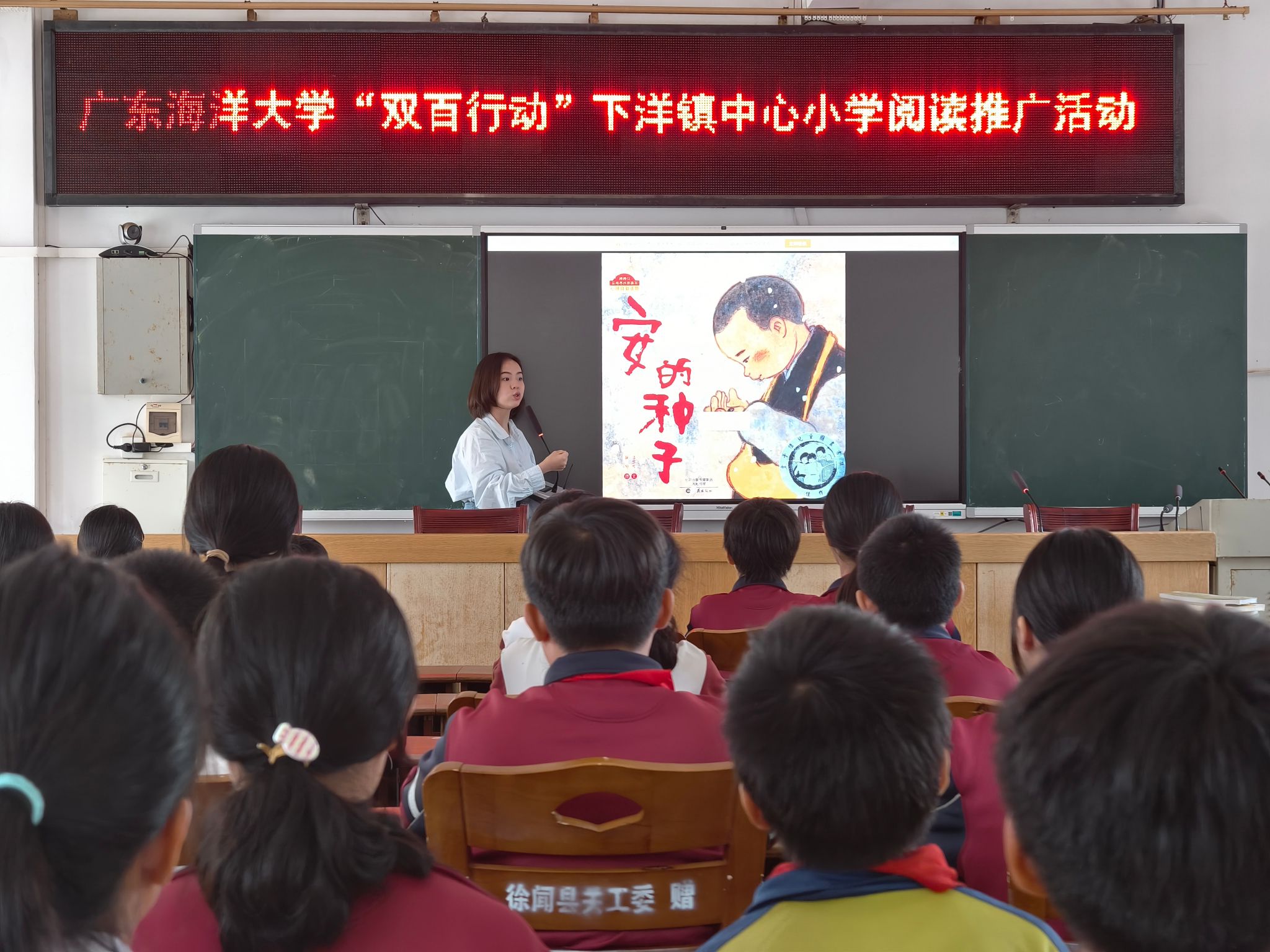 活动当天,为贴合不同年龄段学生的阅读特点,图书馆精准施策,分学段开展特色阅读分享活动。针对高年级学生,今年会官网读者协会带来《安的种子》绘本精读分享,通过生动讲解、互动提问,引导同学们感悟绘本中蕴含的成长智慧,培养耐心与坚持的良好品质。现场氛围热烈,同学们积极举手发言、分享感悟。与此同时,馆员们在下洋镇中心小学相关负责人的带领下,随机走访低年级班级,与孩子们亲切交流,邀请同学们分享近期阅读的书籍,讲述书中的精彩故事。对于积极参与、勇敢分享的同学,馆员们逐一送上精心准备的小礼品,鼓励孩子们保持阅读热情,养成爱读书、读好书、善读书的良好习惯。