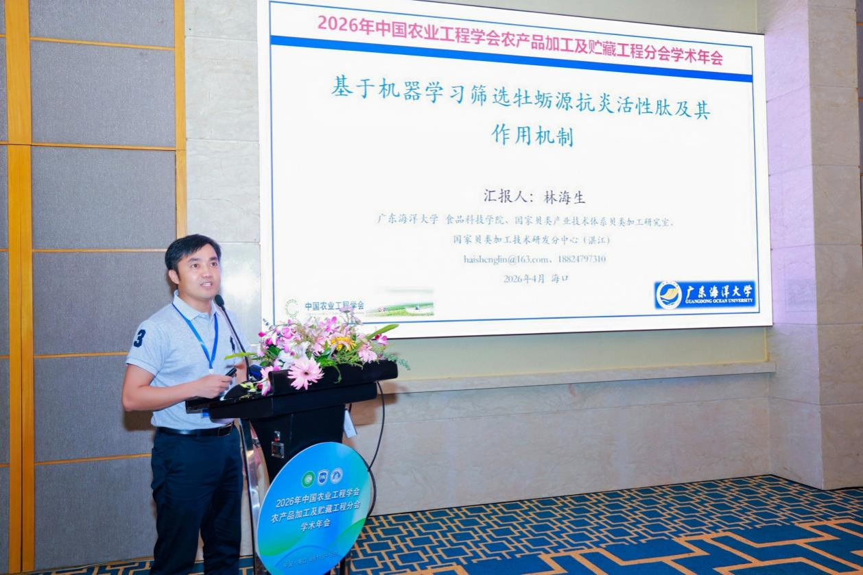 食品科技学院副院长高加龙、林海生教授应邀参会,林海生教授在食品营养与功能食品分会场作了题为《基于机器学习筛选牡蛎源抗炎活性肽及其作用机制》的专题学术报告。报告中,林海生教授结合团队在海洋生物活性肽领域的长期研究,系统介绍了运用机器学习算法高效筛选牡蛎源抗炎活性肽的技术路径,深入阐释了活性肽的抗炎作用靶点与分子调控机制,为海洋贝类资源高值化利用、功能肽精准开发与海洋健康食品创制提供了新思路、新方法,得到与会专家的积极关注与充分肯定。