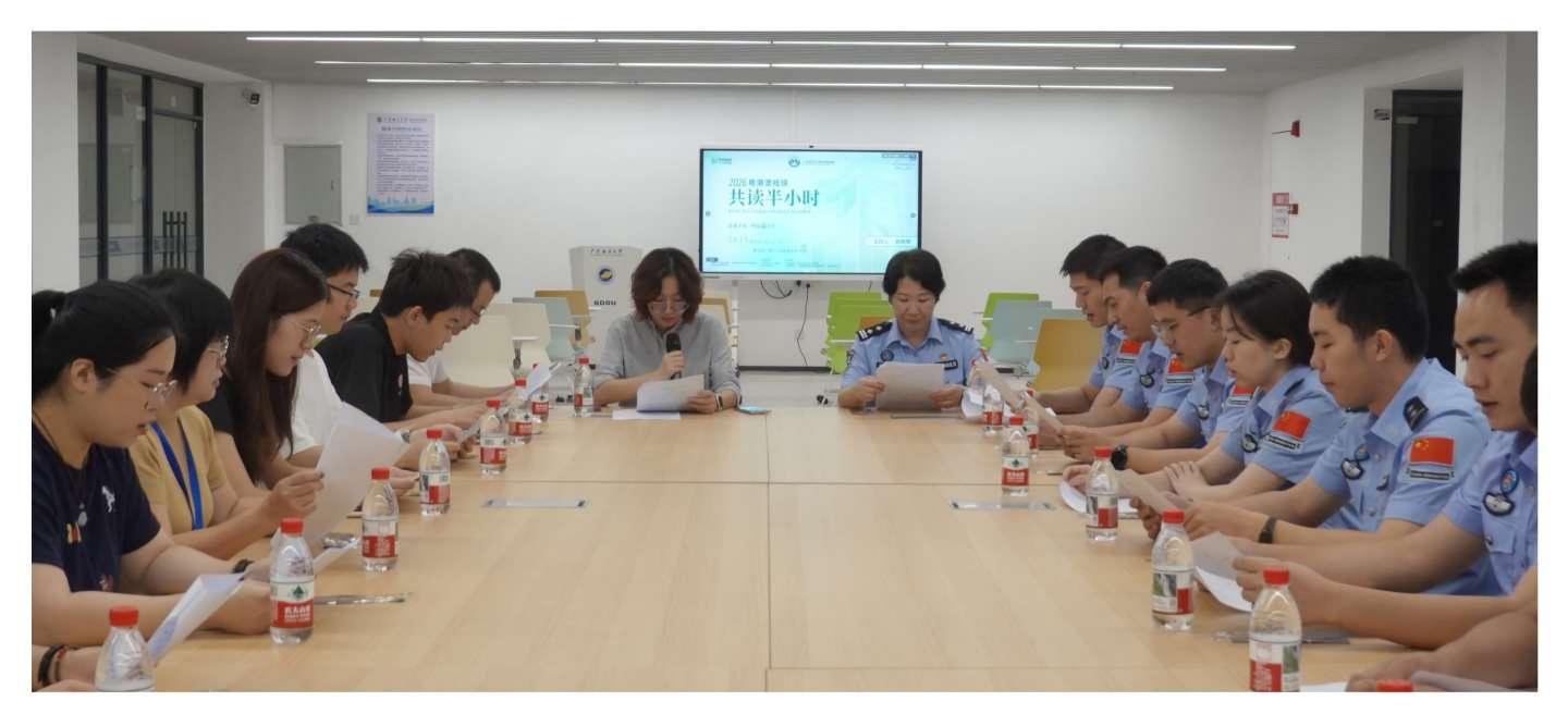 在粤港澳桂琼“共读半小时”环节,阳江出入境边防检查站办公室副主任陈海艳一行及校区师生共30余人参加活动。陈海艳与校区图书馆文化建设与推广部负责人郭雨琴分别领读经典篇目,全员诵读《可爱的中国》节选与《论语》选段。《可爱的中国》情系家国、初心炽热,字里行间饱含使命担当,坚定理想信念。《论语·学而篇》凝聚修身立德、勤学处世的千年智慧,彰显中华优秀传统文化的深厚底蕴与恒久魅力。