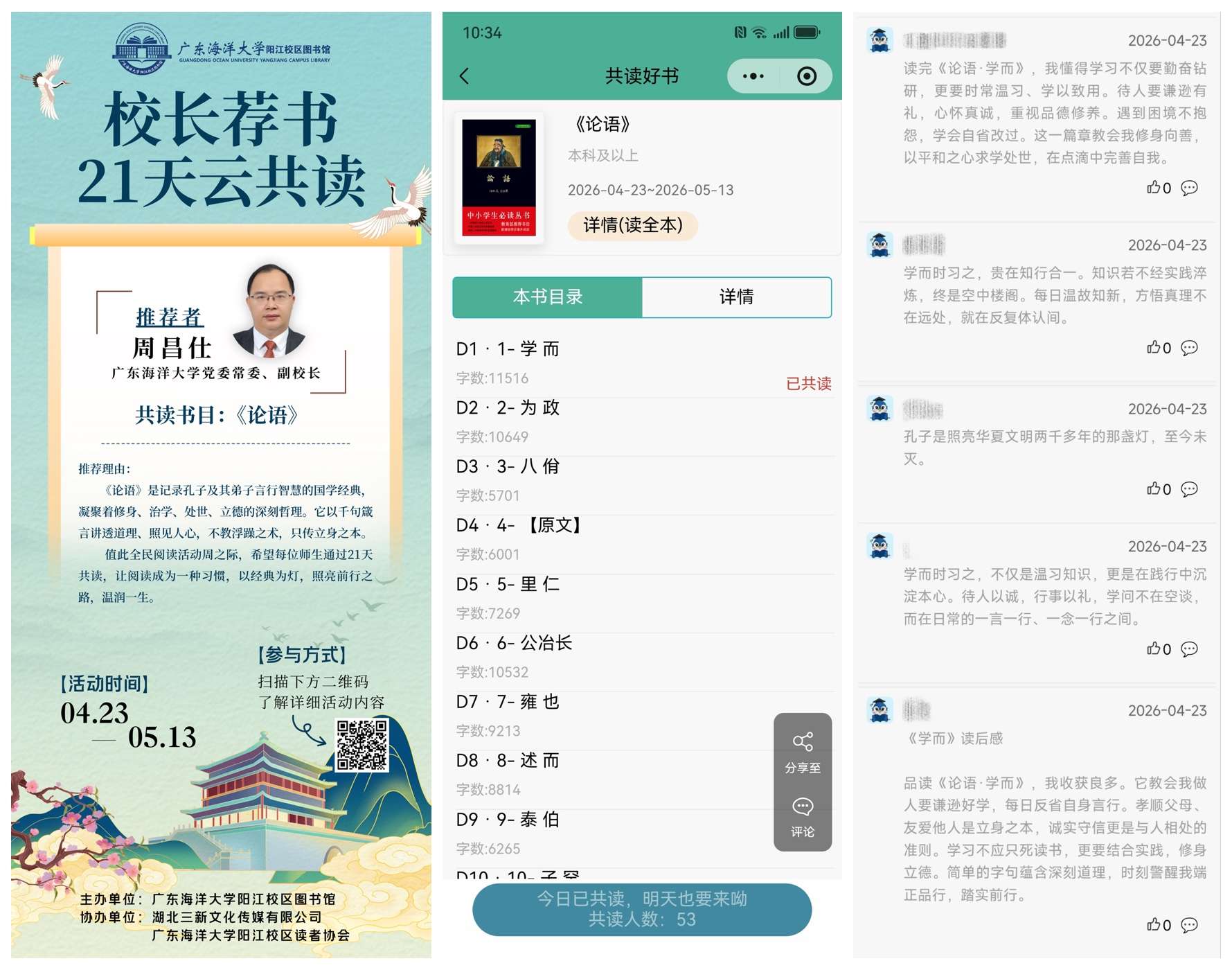 在“校长荐书·21天云共读”活动中,周昌仕倾情荐读国学经典《论语》,引领广大师生品读典籍文脉、体悟国学底蕴,涵养仁爱、诚信、笃学、笃行的传统美德。活动依托21天共读计划,助力师生养成长效阅读习惯,以经典滋养心灵、以书香照亮前路。图书馆同步升级云阅读服务,上线专属共读打卡专区,集成在线阅读、共读音频上传、心得分享、互动交流等功能,搭建线上共读桥梁,共赏书香古韵,赓续中华文脉。