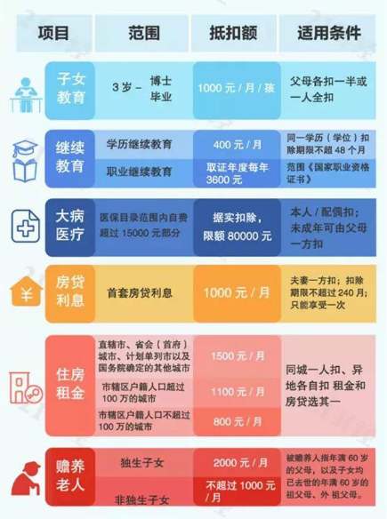 最新的个人所得税改革,是一场征管模式、征管方式的重大变革。共有六项专项附加扣除,即子女教育、继续教育、住房贷款利息、住房租金、大病医疗、赡养老人。具体的扣除金额与要求如下图所示。