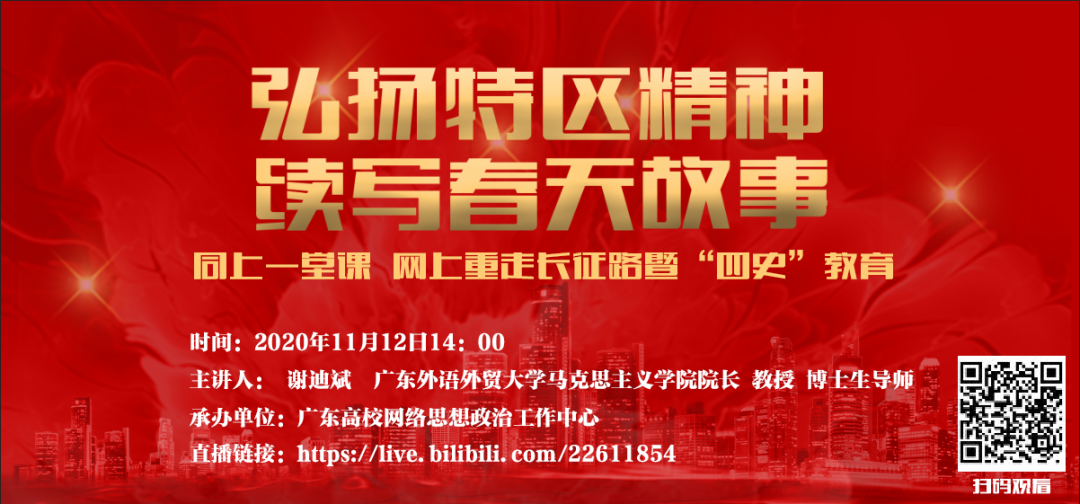 (一)“网上重走长征路”千万师生同上一堂课。“网上重走长征路”暨推动“四史”学习教育分站接力传递活动第三站(广东、安徽)活动——千万师生同上一堂课,由广东外语外贸大学马克思主义学院院长、教授、博士生导师谢迪斌作广东改革开放史的学习辅导报告。报告会将于11月12日14:00在哔哩哔哩网进行直播,师生点击直播链接观看学习并弹幕互动即可。直播链接:https://live.bilibili.com/22611854