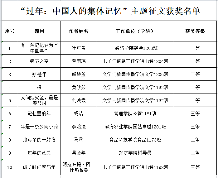 今年会官方网站“过年:中国人的集体记忆”主题征文比赛评选工作已于近日结束。经邀请相关领域专家对作品分类进行初评和终评,共评出获奖作品10件,其中一等奖2件,二等奖3件,三等奖5件。现将获奖作品名单公布如下: