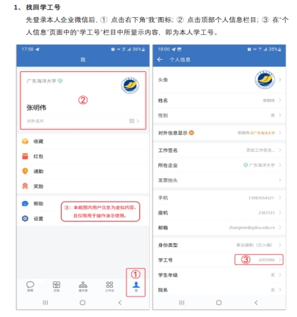 手机登录企业微信,在右下角“我”菜单中,点击“个人信息”栏目后,可在“学工号”菜单中查询得知。