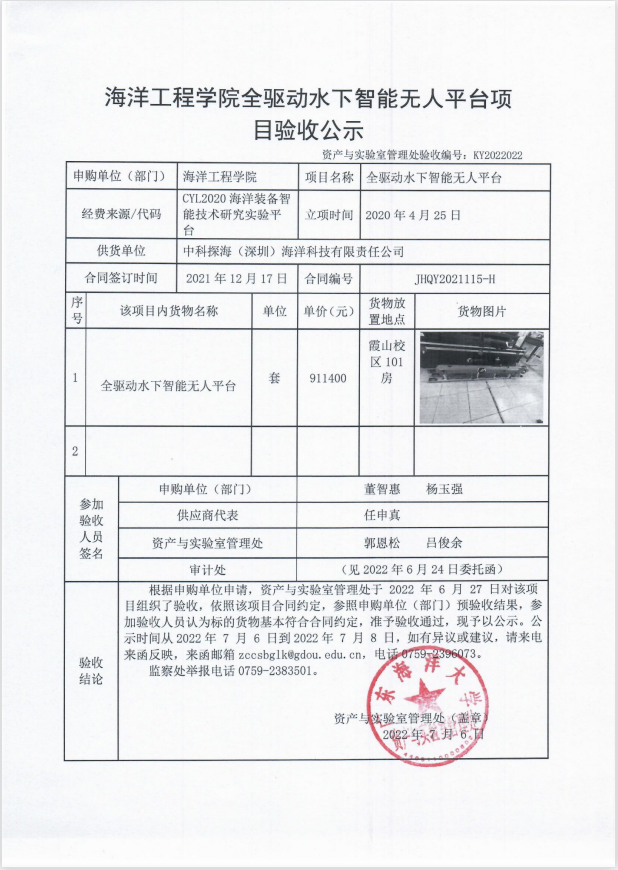 海洋工程学院全驱动水下智能无人平台项目验收公示